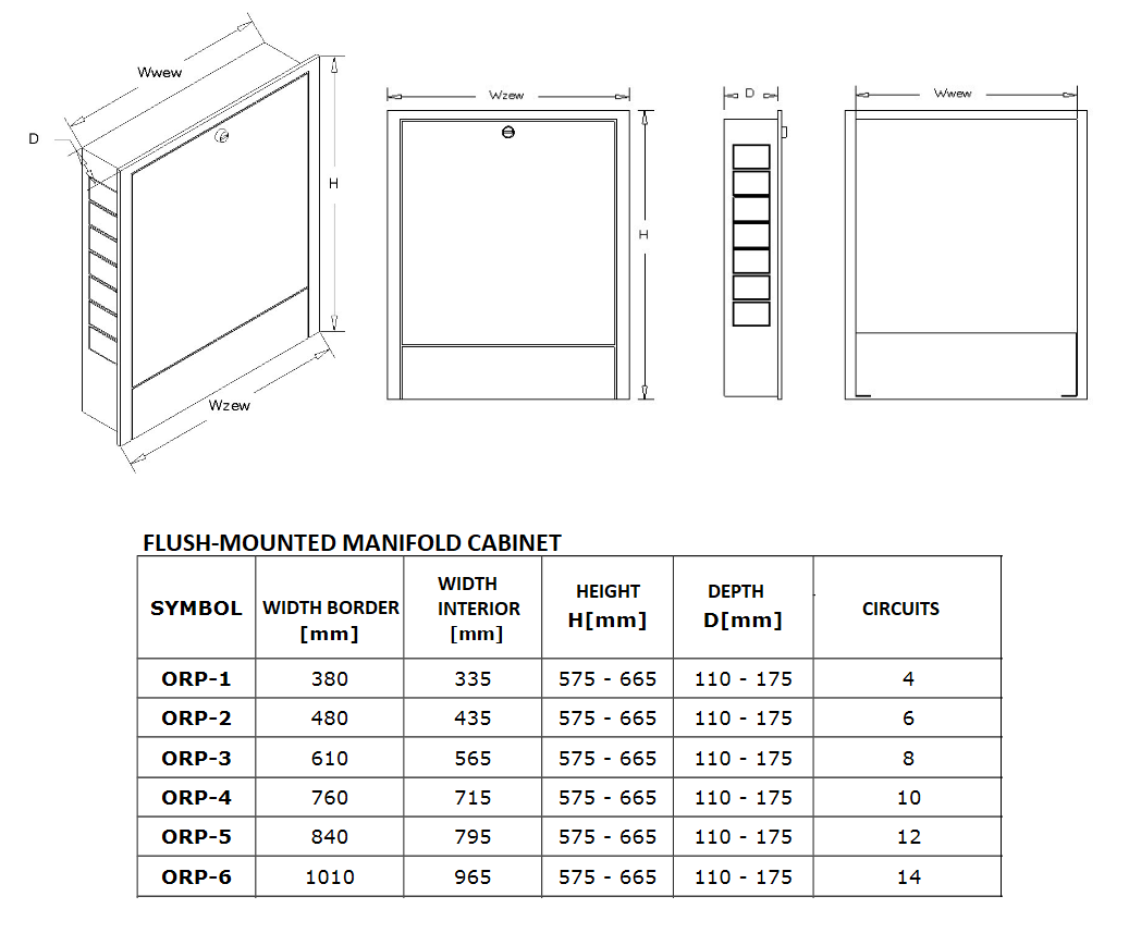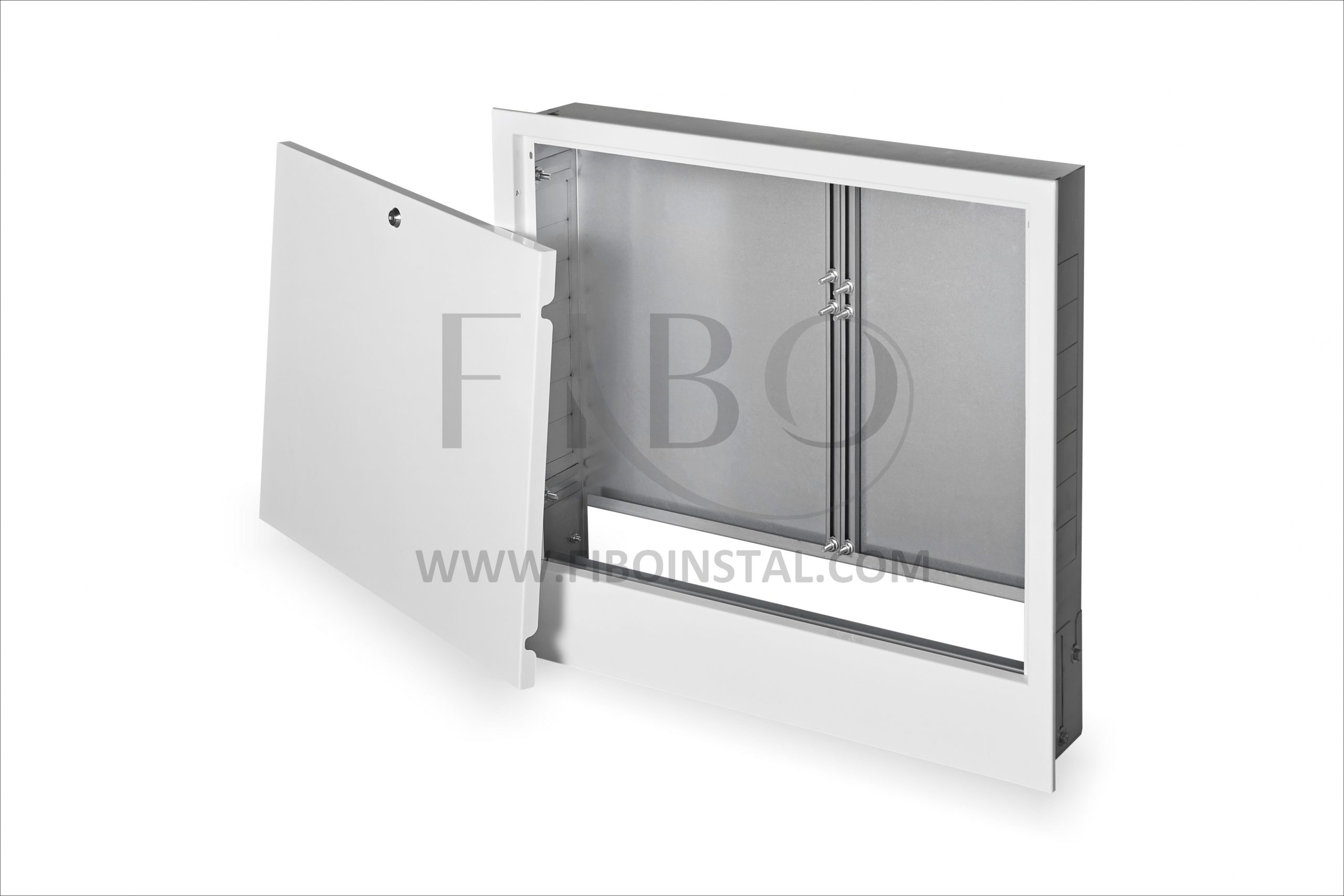 Made entirely of 0.8 mm galvanized steel sheet, additionally the front of the cabinet is powder coated. The installation depth of the cabinet is adjustable, and the front is fully removable, which enables convenient installation of the manifold.
