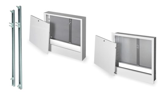 Dodatkowe szyny do metalowej szafki natynkowej lub podtynkowej do rozdzielaczy ogrzewania lub wody użytkowej.