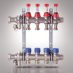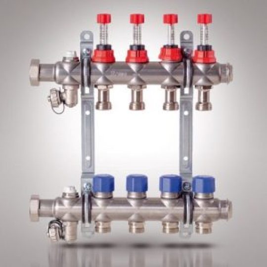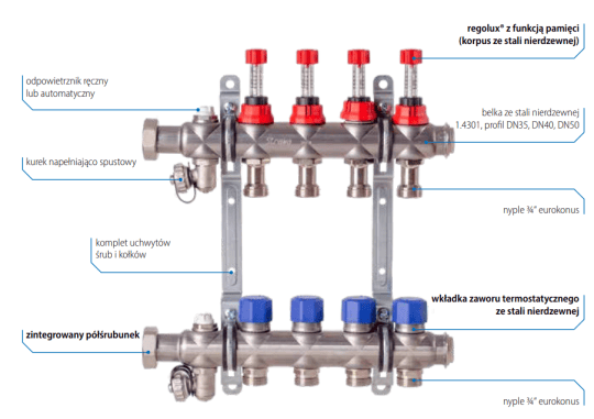 - na belce powrotnej: zintegrowane wkładki termostatyczne; materiał – stal nierdzewna z gwintem M30x1,5 z ręcznymi nakrętkami w kolorze niebieskim