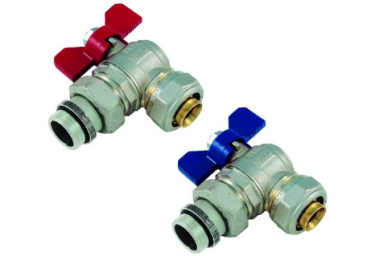 Zawór kulowy kątowy ze śrubunkiem do rozdzielaczy instalacji wody użytkowej, C.O. itp.