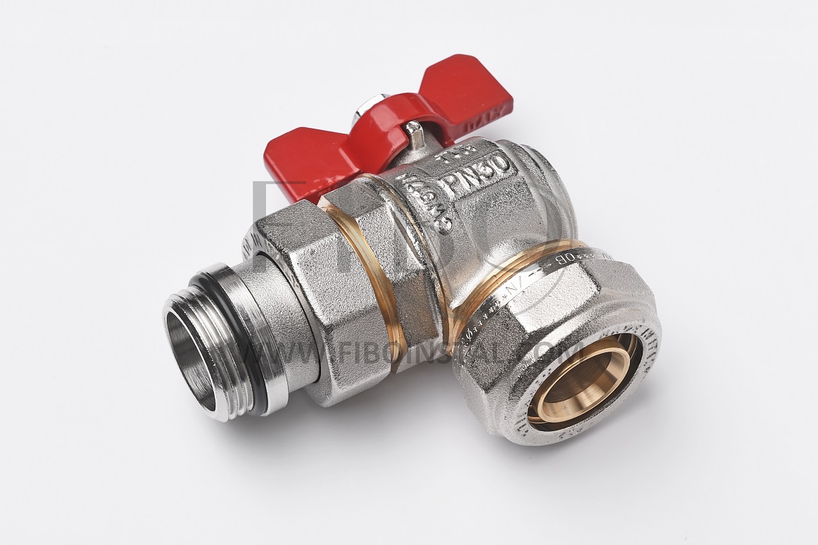 Zawór kulowy kątowy ze śrubunkiem do rozdzielaczy instalacji wody użytkowej, C.O. itp.